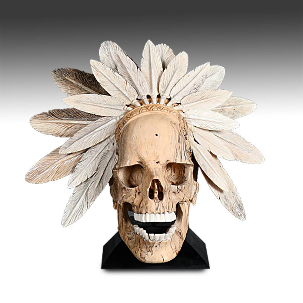 American Indian Skull with Feather Headdress on Plinth Base