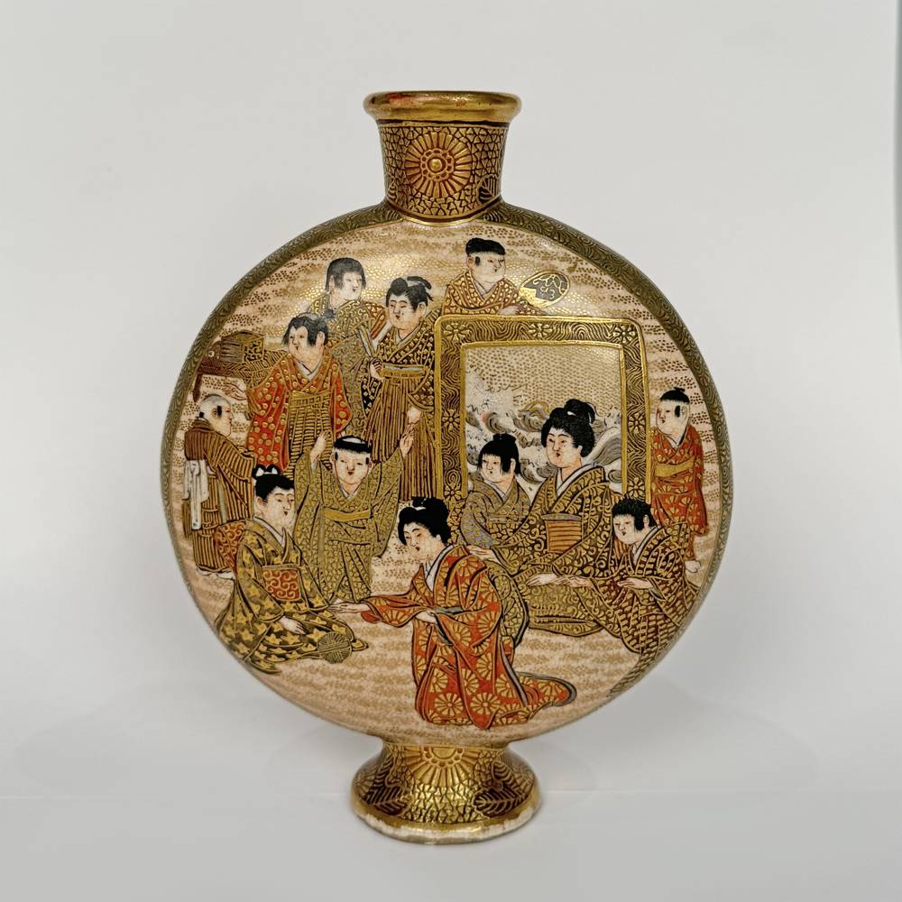 Satsuma Moon Flasque Vase adorned with Samurai & Courtesans
