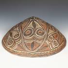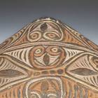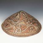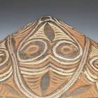 These food bowls, called kamana, originate from the Sawos people in East Sepik Province, Papua New Guinea. Women construct and fire the vessels while men decorate them using chip-carving techniques and natural pigment paints. Despite their elaborate decorations, the bowls are used for everyday meals, propped up by a circular ring of plaited cane. When not in use, they are kept inverted so their designs can be appreciated.