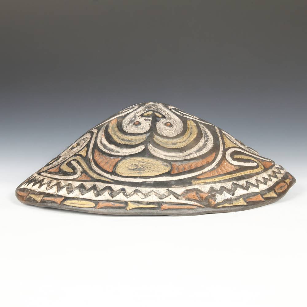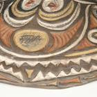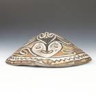 These food bowls, called kamana, originate from the Sawos people in East Sepik Province, Papua New Guinea. Women construct and fire the vessels while men decorate them using chip-carving techniques and natural pigment paints. Despite their elaborate decorations, the bowls are used for everyday meals, propped up by a circular ring of plaited cane. When not in use, they are kept inverted so their designs can be appreciated.