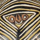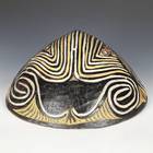 These food bowls, called kamana, originate from the Sawos people in East Sepik Province, Papua New Guinea. Women construct and fire the vessels while men decorate them using chip-carving techniques and natural pigment paints. Despite their elaborate decorations, the bowls are used for everyday meals, propped up by a circular ring of plaited cane. When not in use, they are kept inverted so their designs can be appreciated.