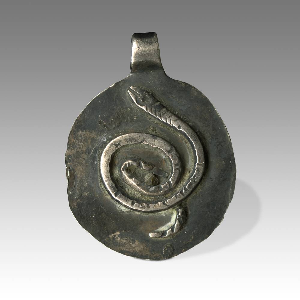 Plaque Amulet Depicting Naga (Snake) with Baby Naga on Reverse