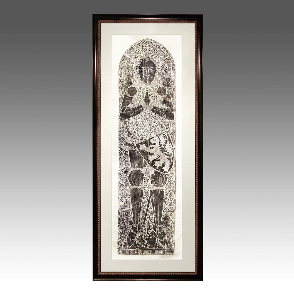 Brass rubbings are reproductions of engraved commemorative plaques, created by placing paper over the plate and rubbing with crayon or chalk. These rubbings were created by Jean Farrell in the 1960s and feature Belgian memorial stones dating from the 14th and 15th centuries. They went on to many private collections as well as museums.