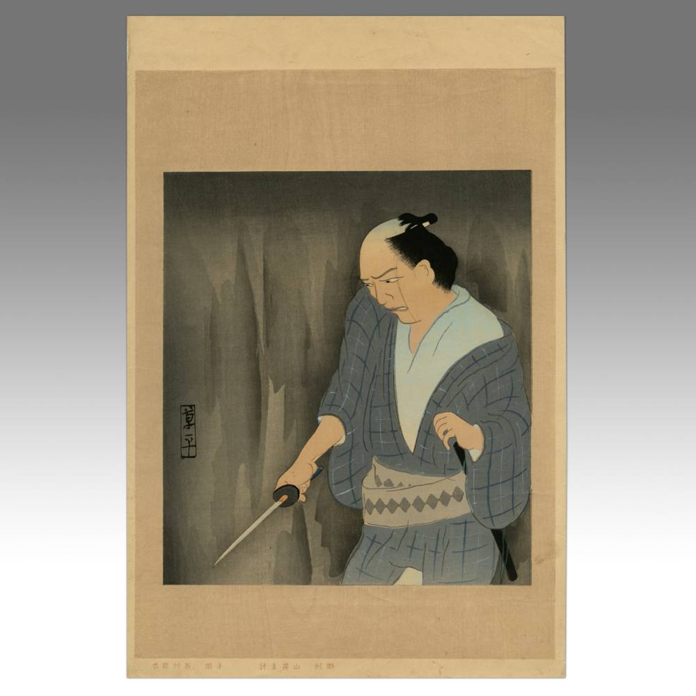 These prints are part of a series known as "Supplements of the Complete Works of Chikamatsu Monzaemon" produced between 1922 and 1926. Each print illustrates a scene or character from the famous works of Monzaemon (1623-1724), who was considered one of the greatest drama writers in Japanese history. Many well known artists collaborated on the series, including Kitano Tsunetomi, Ishikawa Toraji, Yamamura Toyonari, and Kaburagi Kiyokata. Important female painters of the period, Shima Seien and Uemura Shoen, also contributed designs.