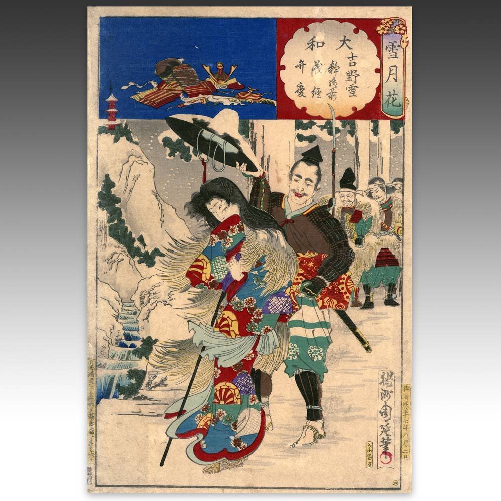 Following the Genpei War in the 12th century, Minamoto no Yoshitsune (1159-1189), one of the most famous samurai warriors in Japanese history, had a falling out with his half brother and new shogun, Yoritomo. This print illustrates Yoshitsune with his beloved mistress Lady Shizuka and loyal retainer Benkei in the mountains of Yoshino where they face Yoritomo's assassins.