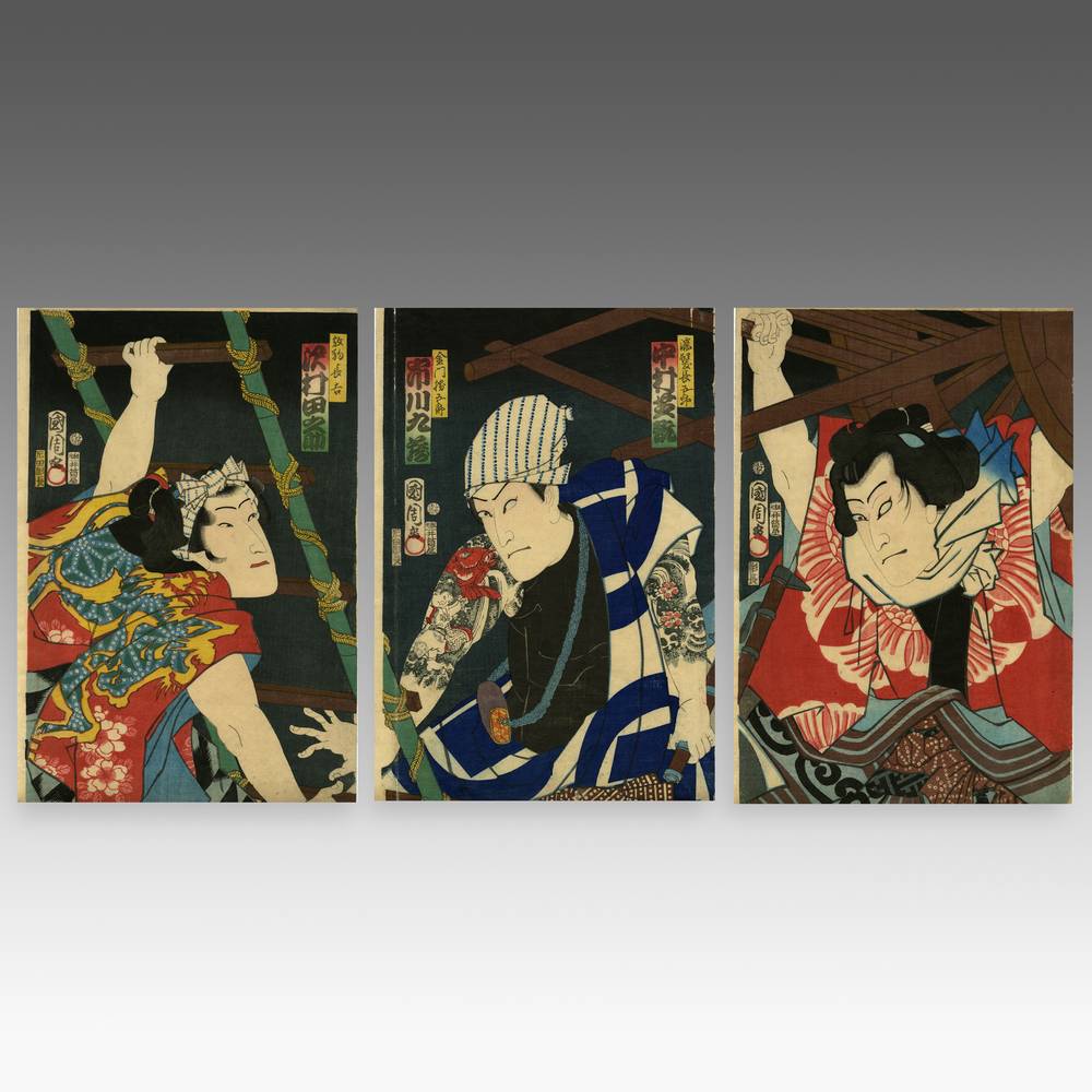 Toyohara Kunichika (1835-1900) was one of the last great Ukiyo-e masters of Japan. He was apprenticed to Utagawa Kunisada and quickly became one of his most talented students, repeatedly ranked among the top ten ukiyo-e artists in Japan. His interest in Kabuki led to him become a master of theatrical prints and his bust portraits of actors are well known. His triptychs depicting scenes from kabuki plays are some of the most dramatic ever produced. Other subjects of his prints included bijin-ga beauties, historical scenes and the contemporary social life of the rapidly-modernizing Meiji period.