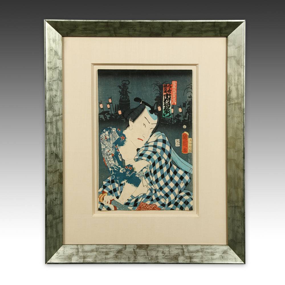 Toyohara Kunichika (1835-1900) was one of the last great Ukiyo-e masters of Japan. He was apprenticed to Utagawa Kunisada and quickly became one of his most talented students, repeatedly ranked among the top ten ukiyo-e artists in Japan. His interest in Kabuki led to him become a master of theatrical prints and his bust portraits of actors are well known. His triptychs depicting scenes from kabuki plays are some of the most dramatic ever produced. Other subjects of his prints included bijin-ga beauties, historical scenes and the contemporary social life of the rapidly-modernizing Meiji period.