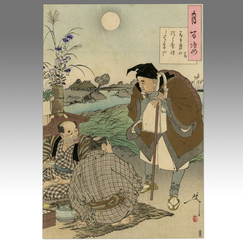 Tsukioka Yoshitoshi (1839-1892) is widely recognized as the last great master of Ukiyo-e and one of the form's greatest innovators. Living the last years of feudal Japan and the first years of modern Japan following the Meiji Restoration, Yoshitoshi was as equally interested in new things as concerned with the loss of traditional Japanese culture. One of his greatest works was this series, One Hundred Aspects of the Moon, depicting scenes from Japanese and Chinese history and legend, with the moon as the unifying element.