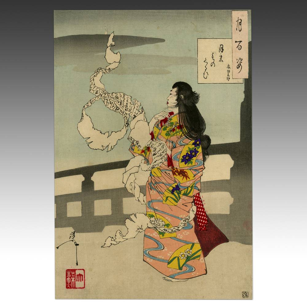 Tsukioka Yoshitoshi (1839-1892) is widely recognized as the last great master of Ukiyo-e and one of the form's greatest innovators. Living the last years of feudal Japan and the first years of modern Japan following the Meiji Restoration, Yoshitoshi was as equally interested in new things as concerned with the loss of traditional Japanese culture. One of his greatest works was this series, One Hundred Aspects of the Moon, depicting scenes from Japanese and Chinese history and legend, with the moon as the unifying element.