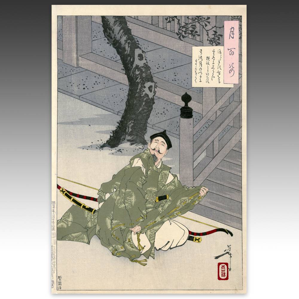Tsukioka Yoshitoshi (1839-1892) is widely recognized as the last great master of Ukiyo-e and one of the form's greatest innovators. Living the last years of feudal Japan and the first years of modern Japan following the Meiji Restoration, Yoshitoshi was as equally interested in new things as concerned with the loss of traditional Japanese culture. One of his greatest works was this series, One Hundred Aspects of the Moon, depicting scenes from Japanese and Chinese history and legend, with the moon as the unifying element.
