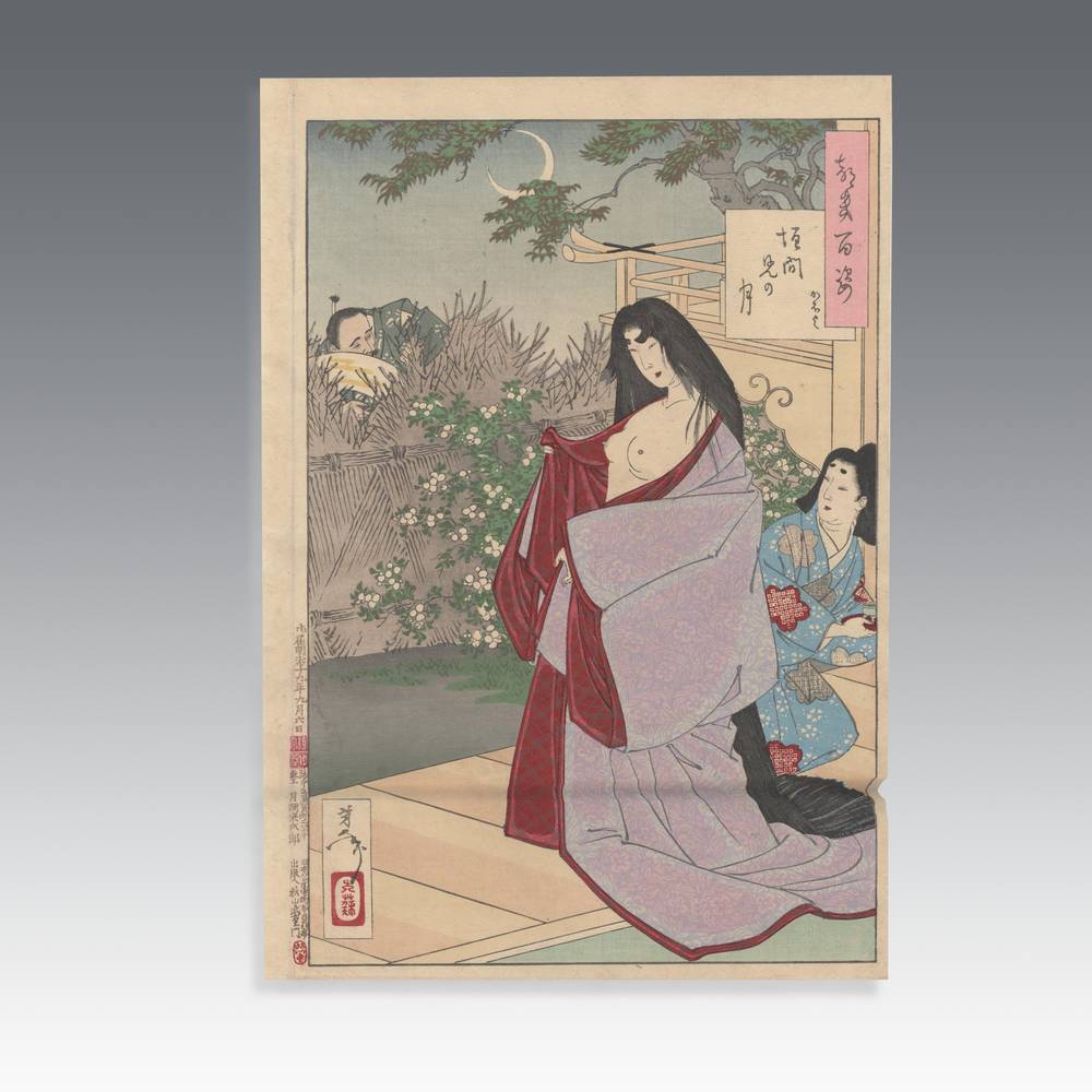 Tsukioka Yoshitoshi (1839-1892) is widely recognized as the last great master of Ukiyo-e and one of the form's greatest innovators. Living the last years of feudal Japan and the first years of modern Japan following the Meiji Restoration, Yoshitoshi was as equally interested in new things as concerned with the loss of traditional Japanese culture. One of his greatest works was this series, One Hundred Aspects of the Moon, depicting scenes from Japanese and Chinese history and legend, with the moon as the unifying element.