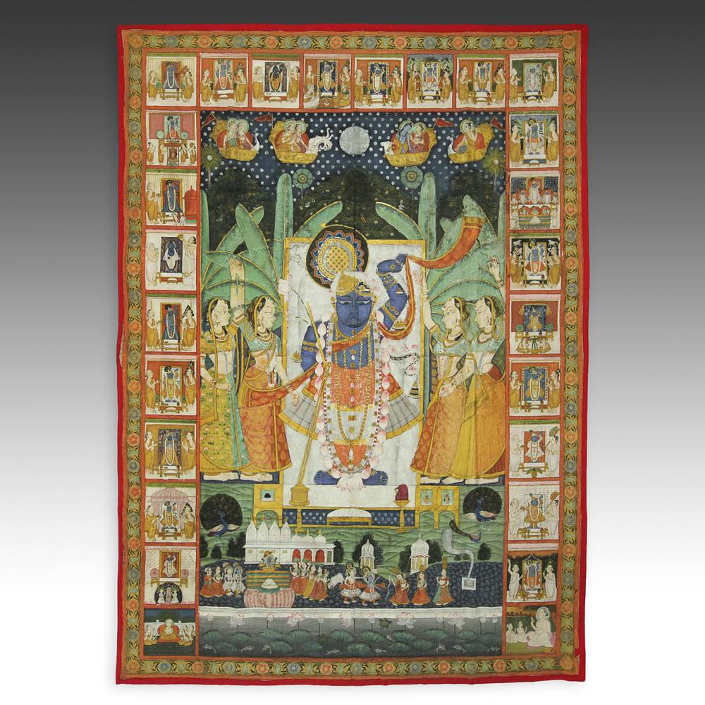 The pichvai (picha — back, and vai — of) is a hanging cloth displayed behind the statue of a deity. In the 15th century the cult of bhakti, or devotion, swept over India... <a href="/stories-descriptions/indian-pichvai-depicting-krishna">Read more</a>