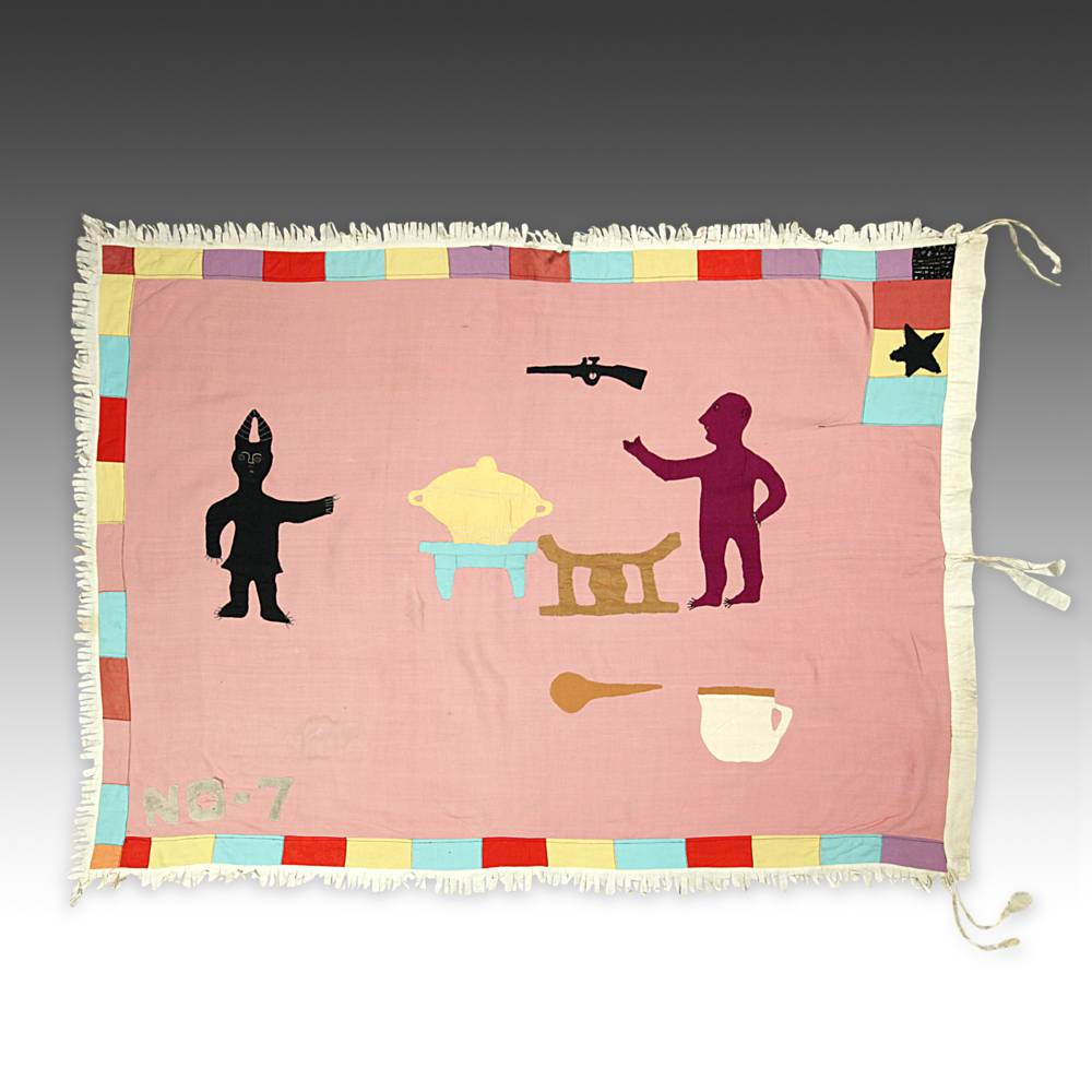 Even though the Akan societies in Ghana had no standing army, the asafo or people's militia, was a well established social and political organization based on military principles. Each asafo group is identified by a particular name and number and through a set of symbols displayed prominently on its flag. Verbal proverbs, a significant facet of Akan culture, are represented by colored cutout figures appliqued on the cotton ground.