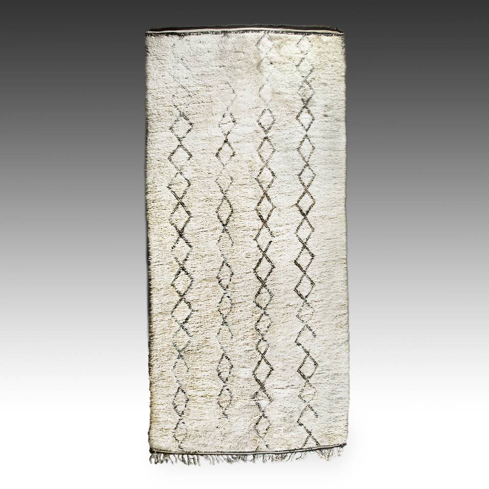 The Beni Ourain people, living in the Middle Atlas ranges of Morocco, weave one of the most unique carpets of the region. Due to their geographic isolation deep in the mountains, they were historically untouched by the influence of Arabic designs. The motifs found on Beni Ourain rugs are abstracted representations of the world and landscapes surrounding the people. Adhering to no rule or formal pattern, the designs on these large, plush rugs have a freshness and spontaneity found no place else.