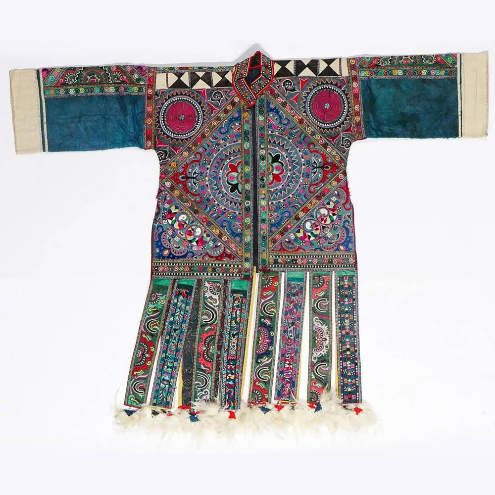 Embroidery, Beads and Feathers at bottom. Ground surface of Pulped Silk, Embroidery Thread from Carded and Spun Silk Thread, Cotton, Seed Beads, Feathers