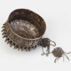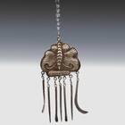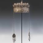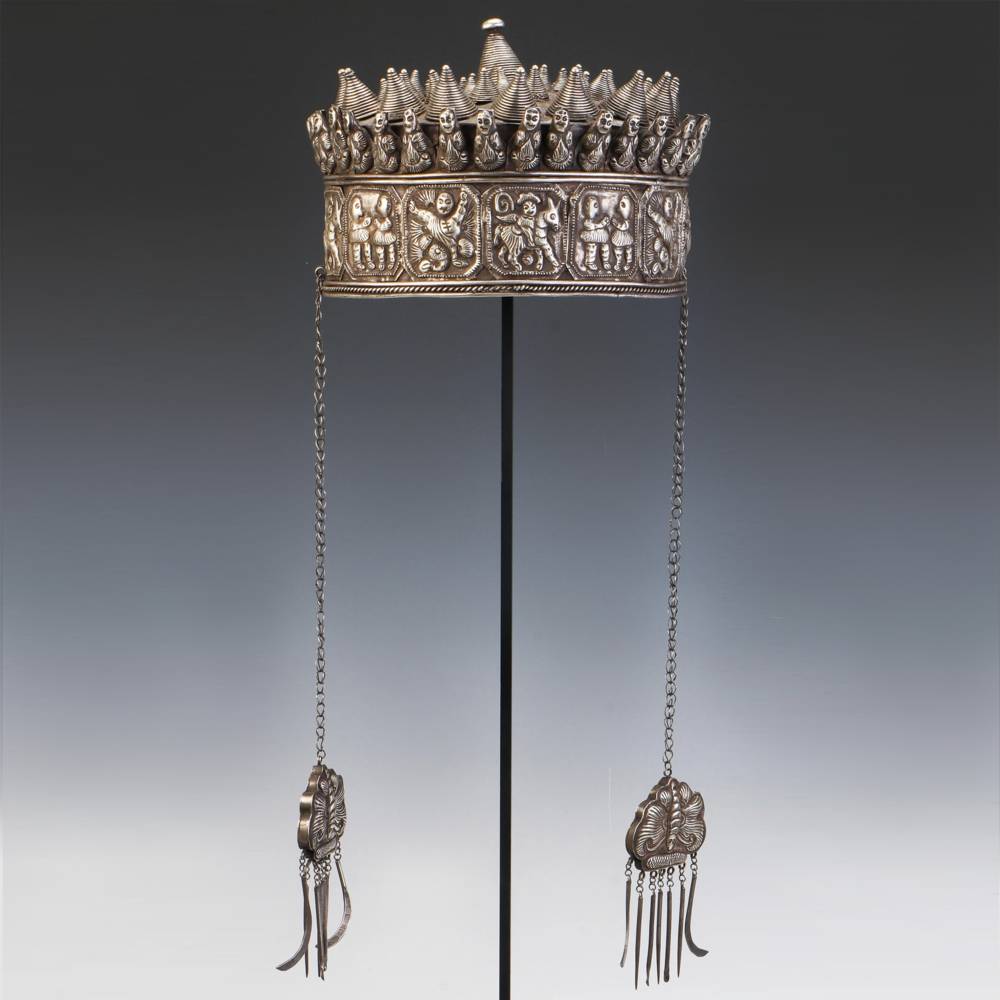 Silver repousse helmet hat with twisted wire cones and dangles and extensive figurative work