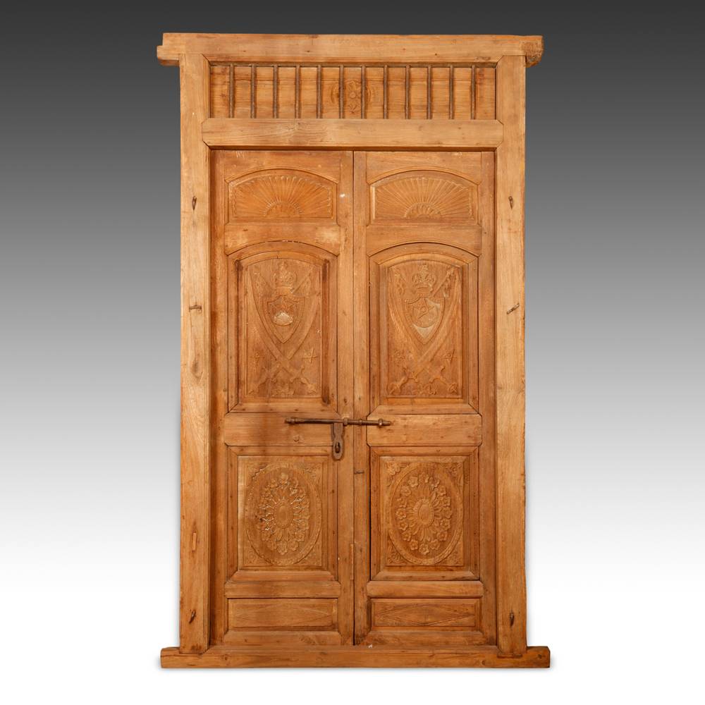 Framed Double Door with Crossed Swords Motif & Iron Transom