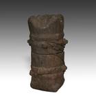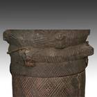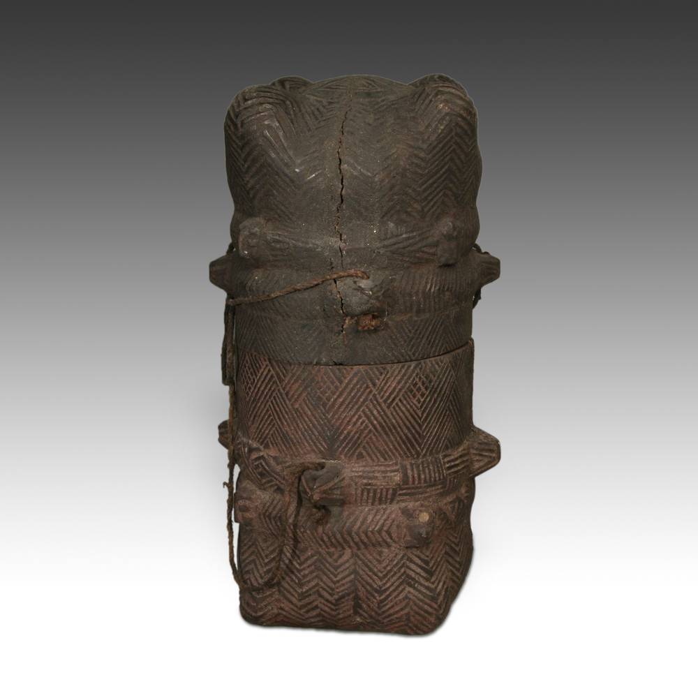 Ornately carved wooden containers such as this were kept by Kuba men in present day south-central Democratic Republic of Congo to store costume accessories and items used for personal care. The carved surface of the container features the same geometric designs made popular in the woven raffia skirts and velvet panels of the Kuba. The vessel's shape is a common basketry form among the Kuba. The replication of a woven basketry artifact in carved wood is characteristic of the playful invention of Kuba personal arts.