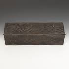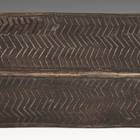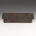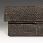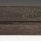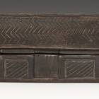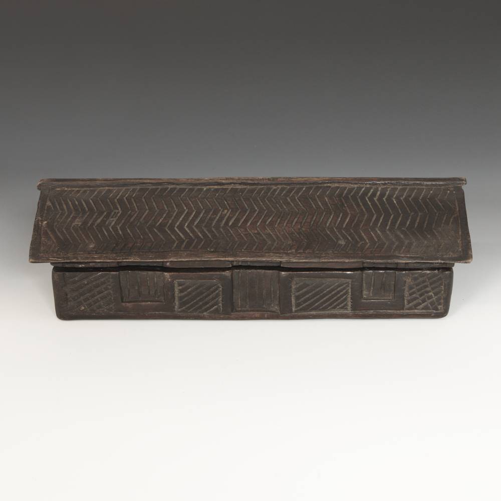 Ornately carved wooden containers such as this were kept by Kuba men in present day south-central Democratic Republic of Congo to store costume accessories and items used for personal care. These included razors, beads, and camwood powder which was used to coat and beautify the skin. The carved surface of the container features the same geometric designs made popular in the woven raffia skirts and velvet panels of the Kuba.