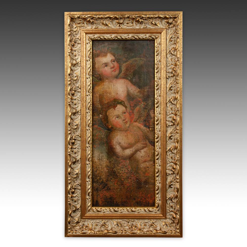 Colonial Religious Scene Depicting Putti or Angels, Framed