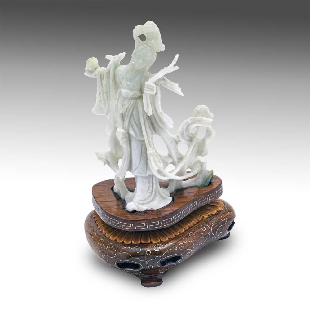 CARVED WHITE JADE QUAN YIN FIGURE ON SILVER INCISED WOOD BASE