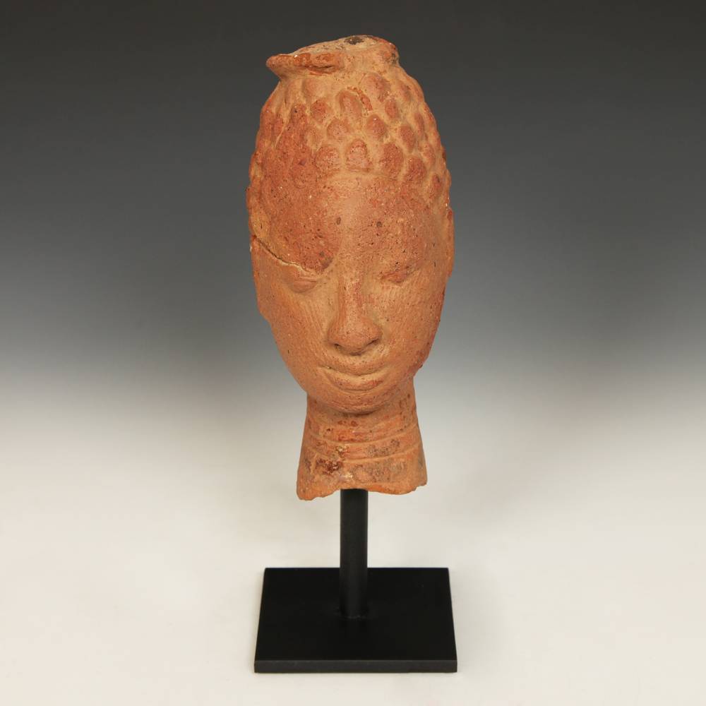 In Ife, southwest Nigeria, a substantial number of anthropomorphic and zoomorphic sculptures were produced from terracotta between the 11th and 15th centuries. Among them were life-sized heads and exceptional figurines around 20 inches high, crowned and wearing heavy necklaces. Many such terracottas would be associated with shrines but most of these pieces have been found in secondary sites where they were integrated into contemporary ritual, making it difficult to know their original function. Some of the faces feature delicately rendered vertical etchings, generally thought to represent scarification marks.