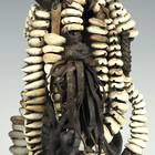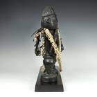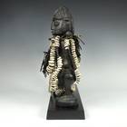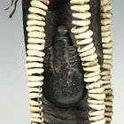 "There is one distinguishing feature of all Esu figures: a long phallic hairstyle protruding from the top of the head and often falling down the back of the head. These sculptures portray both the orisa and his or her devotees. The carving, painted black (deep indigo dye) with long strands of cowrie shells descending from its neck or feet, to which are attached carvings of small mirrors, combs and flutes, as well as small bells, represent Esu's ase, the deity's person and power. Esu crosses boundaries, creates trouble for those unwilling to make sacrifice and brings to fruition human hopes and aspirations." -- from Ibeji: The Cult of the Yoruba Twins, by George Chemeche