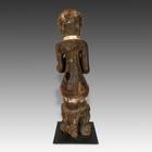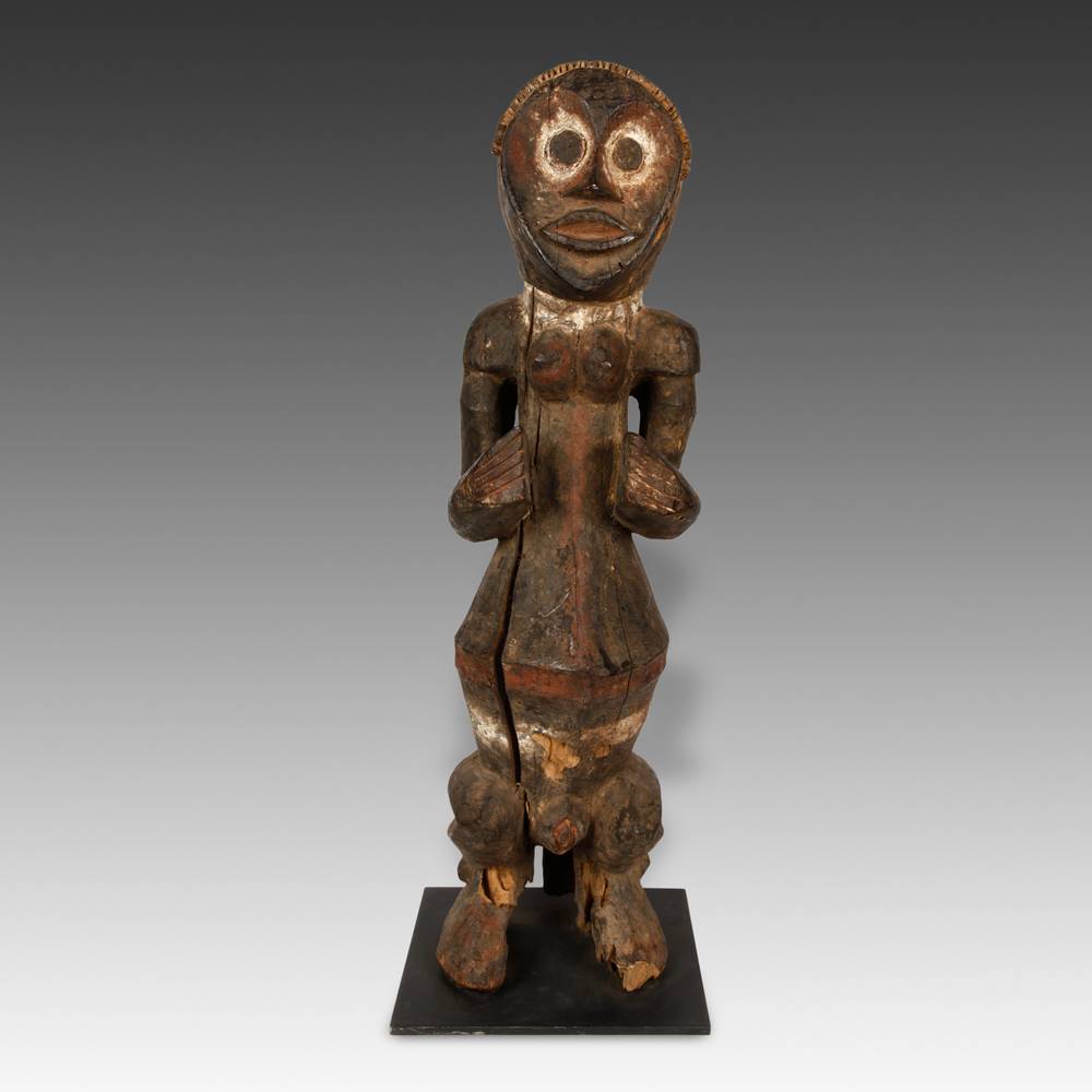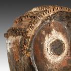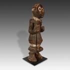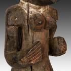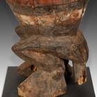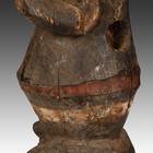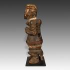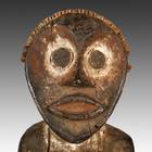 The Mambila people live in the region bordering Cameroon and Nigeria. Though they have no centralized hierarchical structure, they believe their ancestors intercede to protect the well-being of the living. The tadep figures represent and are created to honor ancestor spirits. They are characterized by a heart-shaped face and a large head lined with short wooden pegs, traditionally carved from a single piece of wood.