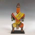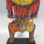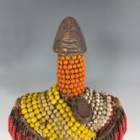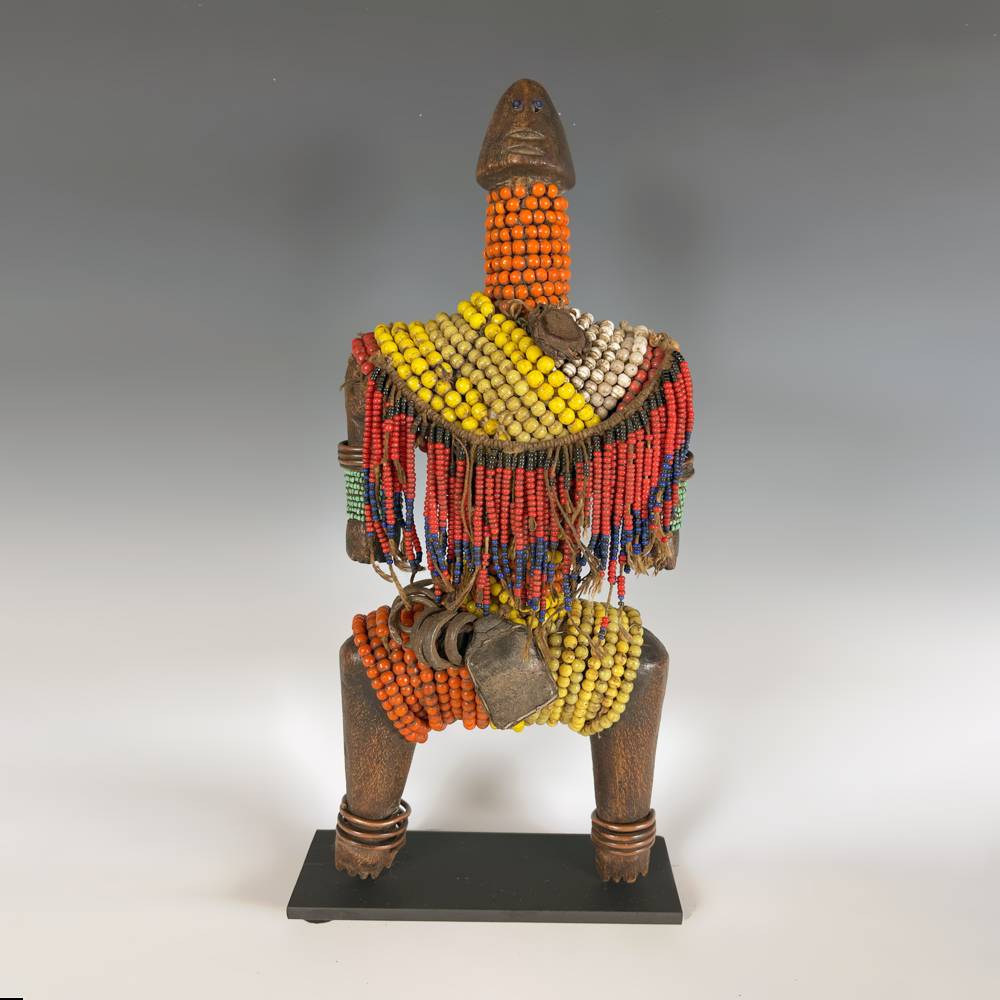 CARVED WOOD WITH GLASS BEADS, COPPER WIRE, LEATHER AMULETS & COWRIE SHELLS