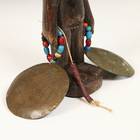 CARVED WOOD WITH BEADS AND BRONZE CYMBALS