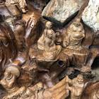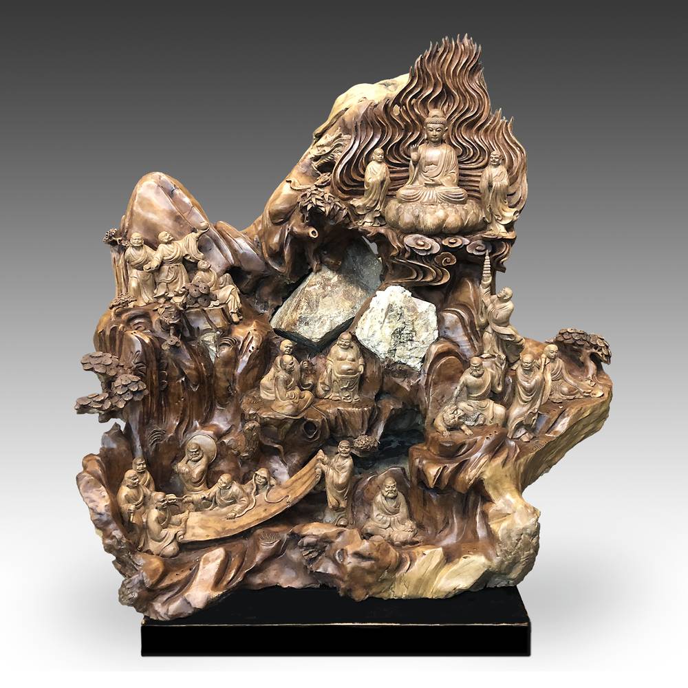 Root Carving depicting Buddha with Attendants and 18 Lohan
