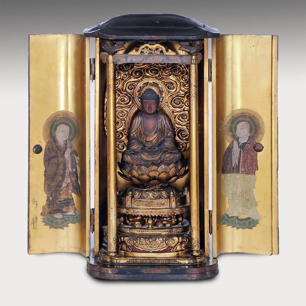 Boxed Shrine showing Seated Buddha on Lotus with Painted Attendants on Doors