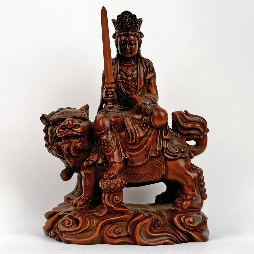 Hand Carved Figure of Manjushri Riding Lion
