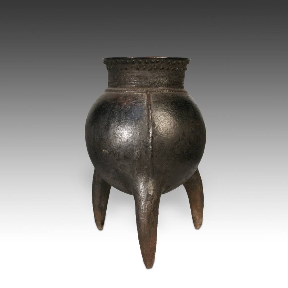 The Chamba people of Nigeria and Cameroon believe in a cosmic world in which the interaction between God, the dead, the creatures of the wild and human beings, constitute a common arena of daily concern. Additionally, they are concerned with the management of potentially dangerous agents called 'jup' that manifest through performances such as libations and sacrifices. While we do not know if these striking 3-legged pots were for food preparation or ritual use, that does not diminish their wonderful form and workmanship as objects of beauty and spiritual presence.