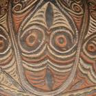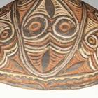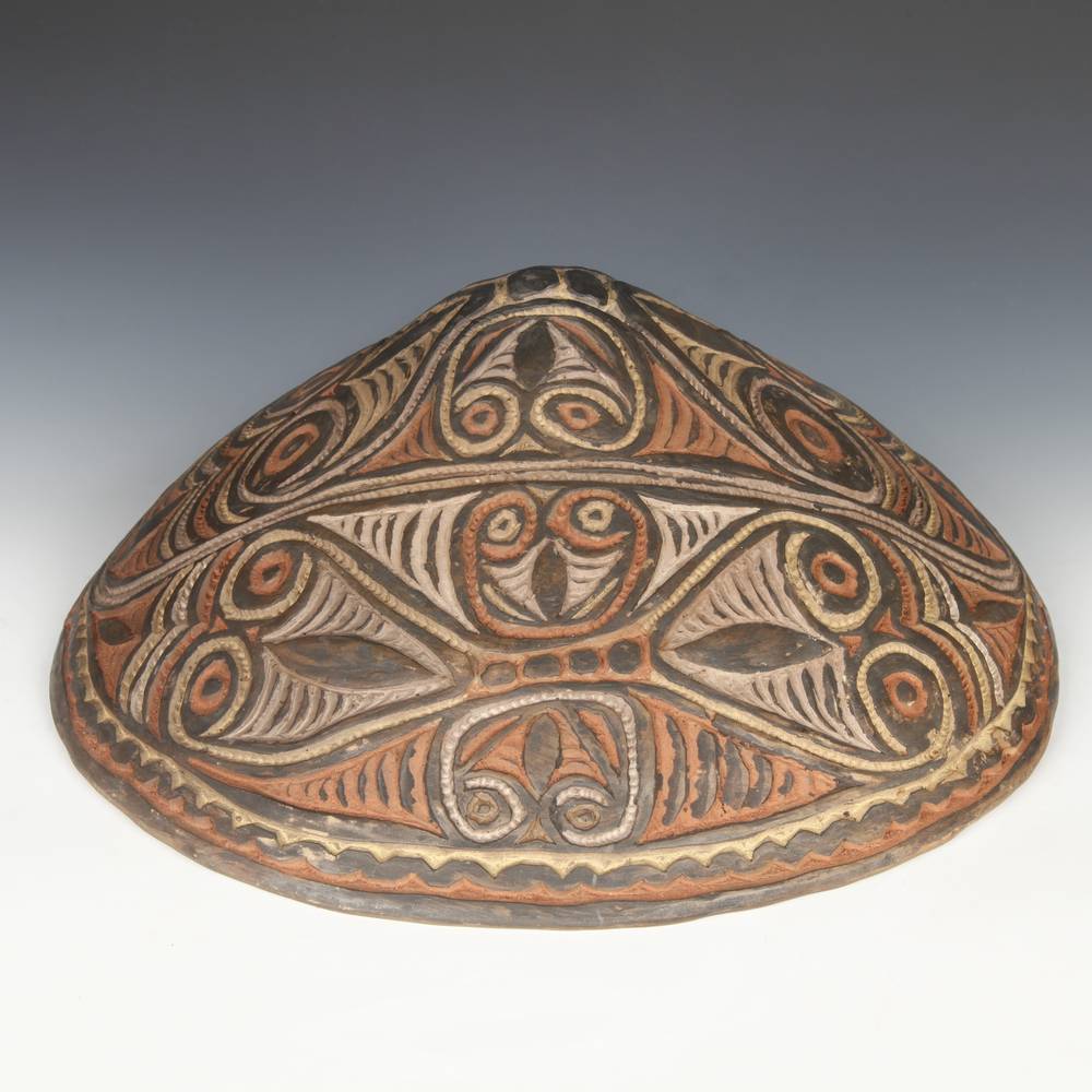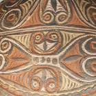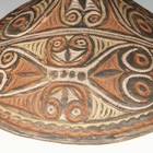 These food bowls, called kamana, originate from the Sawos people in East Sepik Province, Papua New Guinea. Women construct and fire the vessels while men decorate them using chip-carving techniques and natural pigment paints. Despite their elaborate decorations, the bowls are used for everyday meals, propped up by a circular ring of plaited cane. When not in use, they are kept inverted so their designs can be appreciated.