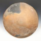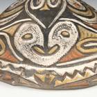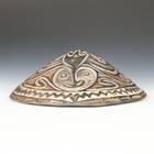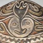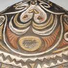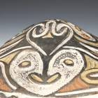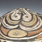 These food bowls, called kamana, originate from the Sawos people in East Sepik Province, Papua New Guinea. Women construct and fire the vessels while men decorate them using chip-carving techniques and natural pigment paints. Despite their elaborate decorations, the bowls are used for everyday meals, propped up by a circular ring of plaited cane. When not in use, they are kept inverted so their designs can be appreciated.