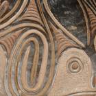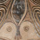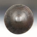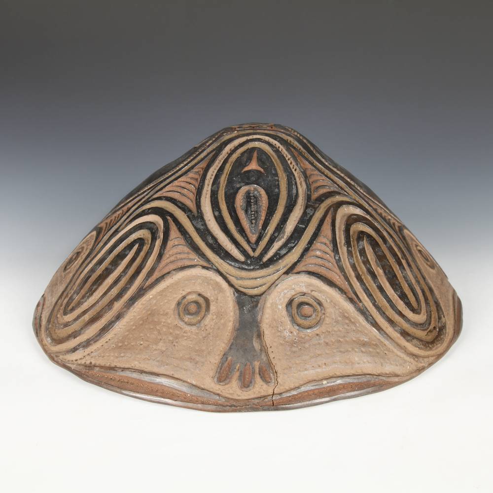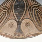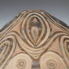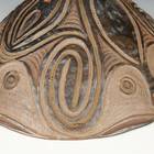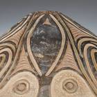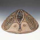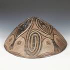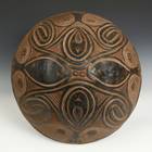 These food bowls, called kamana, originate from the Sawos people in East Sepik Province, Papua New Guinea. Women construct and fire the vessels while men decorate them using chip-carving techniques and natural pigment paints. Despite their elaborate decorations, the bowls are used for everyday meals, propped up by a circular ring of plaited cane. When not in use, they are kept inverted so their designs can be appreciated.