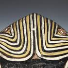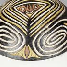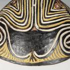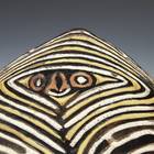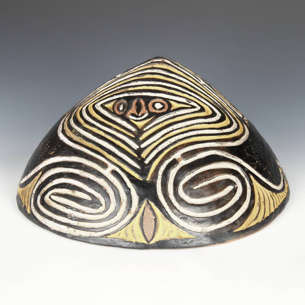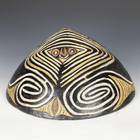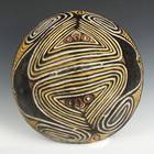 These food bowls, called kamana, originate from the Sawos people in East Sepik Province, Papua New Guinea. Women construct and fire the vessels while men decorate them using chip-carving techniques and natural pigment paints. Despite their elaborate decorations, the bowls are used for everyday meals, propped up by a circular ring of plaited cane. When not in use, they are kept inverted so their designs can be appreciated.