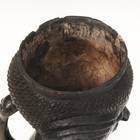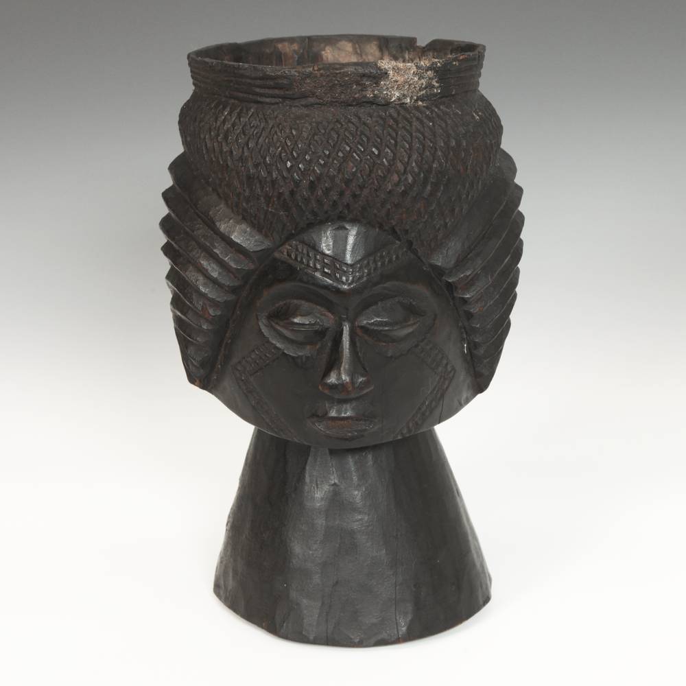In the courts of the wealthy Kuba kingdom founded in the early 17th century in present day Democratic Republic of Congo, elaborately crafted drinking vessels held great symbolic value. Distributing large quantities of palm wine was a way of displaying wealth and generosity among titleholders and member of the aristocracy. These wooden libation cups were often carved with human and animals forms that communicated the ideals of refinement and power.