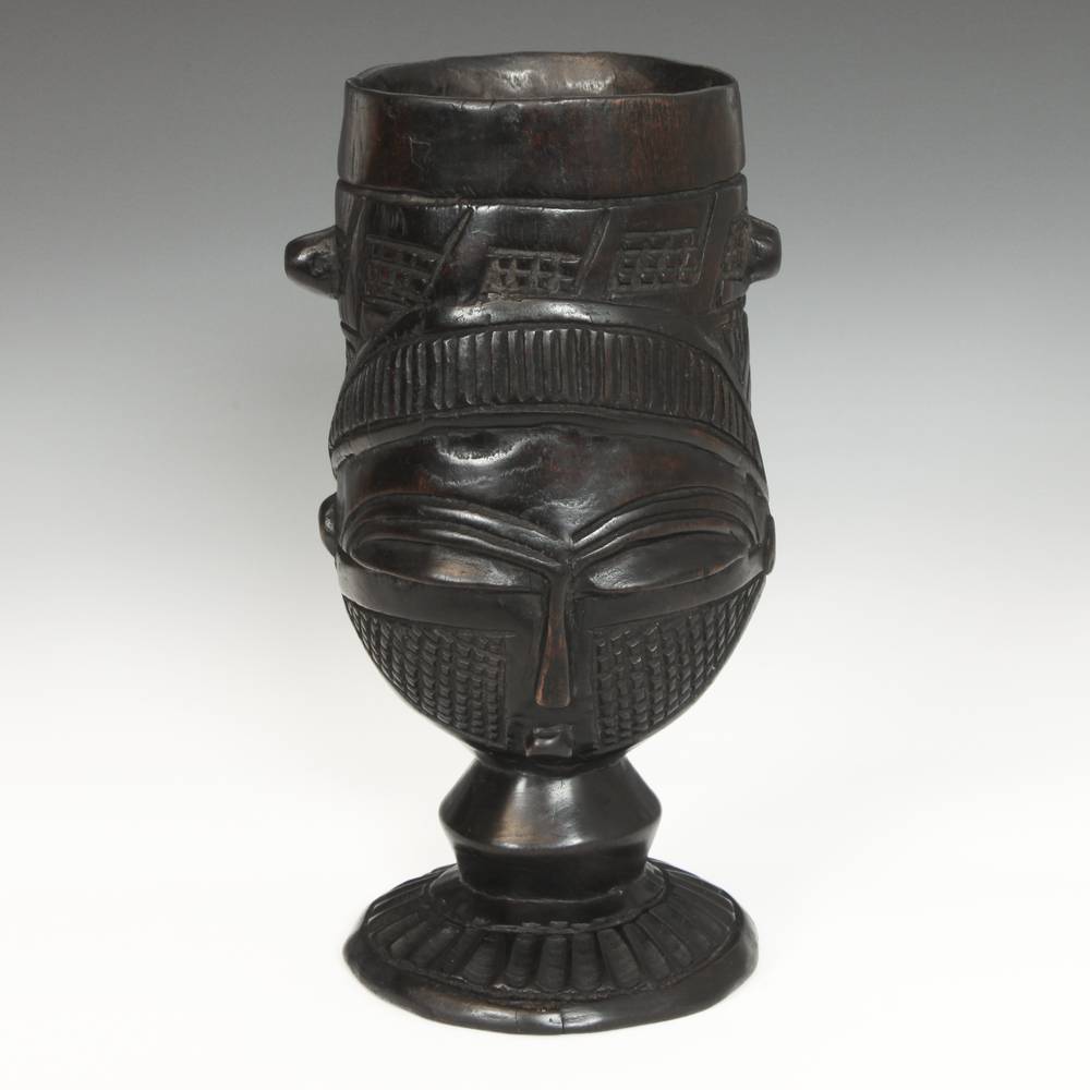 In the courts of the wealthy Kuba kingdom founded in the early 17th century in present day Democratic Republic of Congo, elaborately crafted drinking vessels held great symbolic value. Distributing large quantities of palm wine was a way of displaying wealth and generosity among titleholders and member of the aristocracy. These wooden libation cups were often carved with human and animals forms that communicated the ideals of refinement and power.
