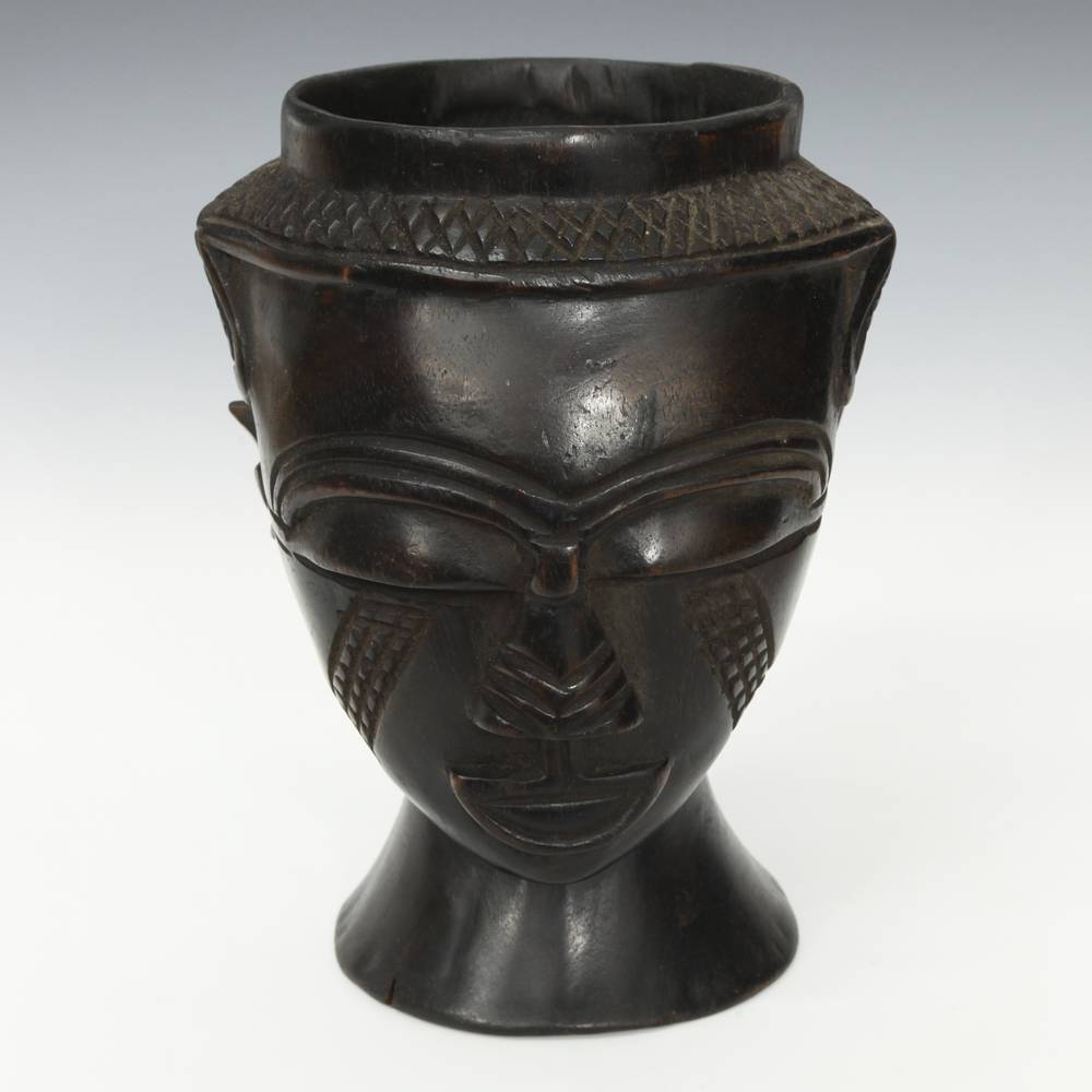 In the courts of the wealthy Kuba kingdom founded in the early 17th century in present day Democratic Republic of Congo, elaborately crafted drinking vessels held great symbolic value. Distributing large quantities of palm wine was a way of displaying wealth and generosity among titleholders and member of the aristocracy. These wooden libation cups were often carved with human and animals forms that communicated the ideals of refinement and power.