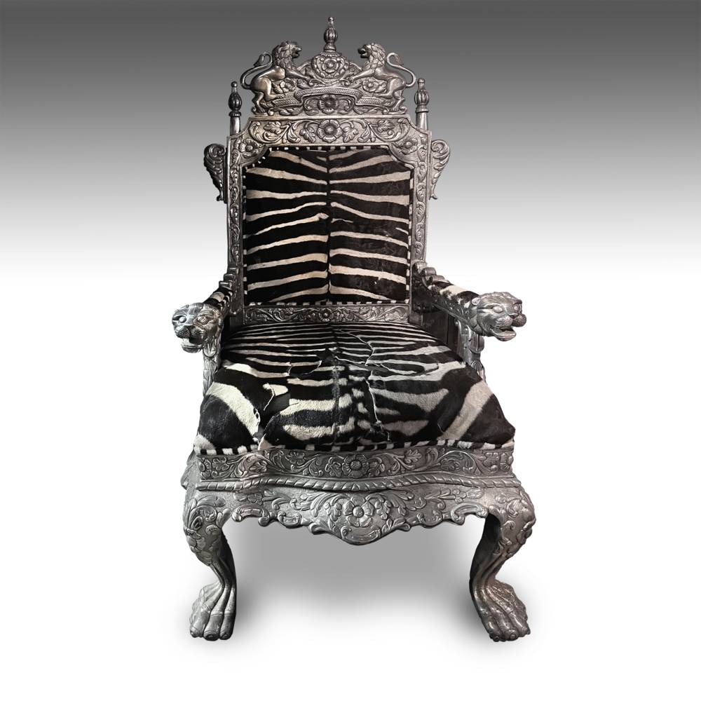 Throne Chair; Silver Clad over Teakwood with Zebra Hide Upholstery