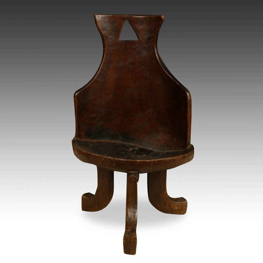 This rare and beautiful period chair is from the Jimma region of Ethiopia and is hand-carved from a single piece of hardwood (unlike modern reproductions, which are frequently manufactured from soft woods). It is probably between 60 and 80 years old and has a beautiful dark patina. As with all chairs and stools of this style from Jimma, the chair has three feet.