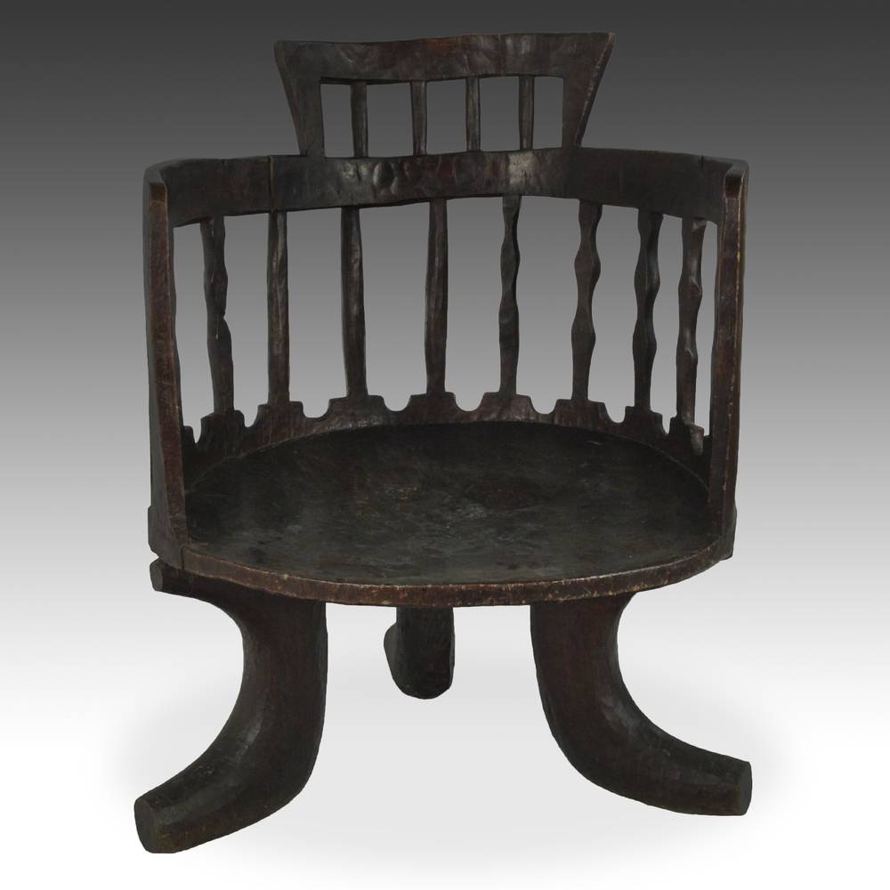 This rare and beautiful period chair is from the Jimma region of Ethiopia and is hand-carved from a single piece of hardwood (unlike modern reproductions, which are frequently manufactured from soft woods). It is probably between 60 and 80 years old and has a beautiful dark patina. As with all chairs and stools of this style from Jimma, the chair has three feet.