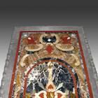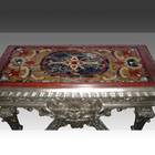 Carved teak wood clad with silver repousse; hardstone marquetry top