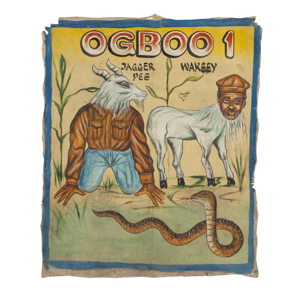 During the late 1980s, a cottage industry developed in Ghana, West Africa, called "mobile cinema." Entrepreneurs travelled from village to village with a TV, VCR and a portable gas powered generator and showed movies. The need to attract customers gave birth to what is now recognized as a distinctive, compelling collectible — the Ghanaian movie poster. They almost always present a lurid, colorful patchwork of images intended to attract, engage and entice the viewer. Though sometimes grotesque, melodramatic or downright ludicrous, they are unfailingly memorable, indeed unforgettable.
