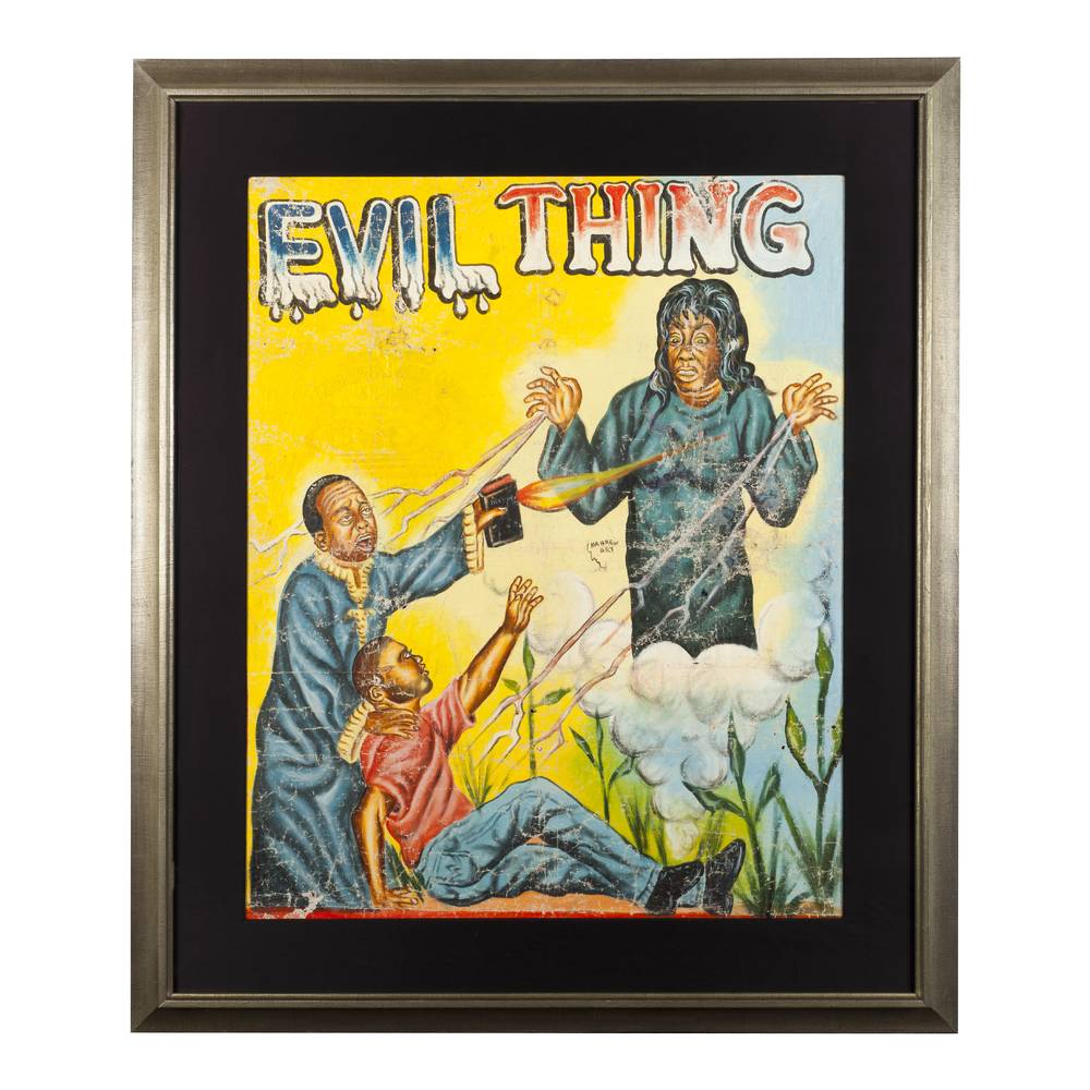 During the late 1980s, a cottage industry developed in Ghana, West Africa, called "mobile cinema." Entrepreneurs travelled from village to village with a TV, VCR and a portable gas powered generator and showed movies. The need to attract customers gave birth to what is now recognized as a distinctive, compelling collectible — the Ghanaian movie poster. They almost always present a lurid, colorful patchwork of images intended to attract, engage and entice the viewer. Though sometimes grotesque, melodramatic or downright ludicrous, they are unfailingly memorable, indeed unforgettable.