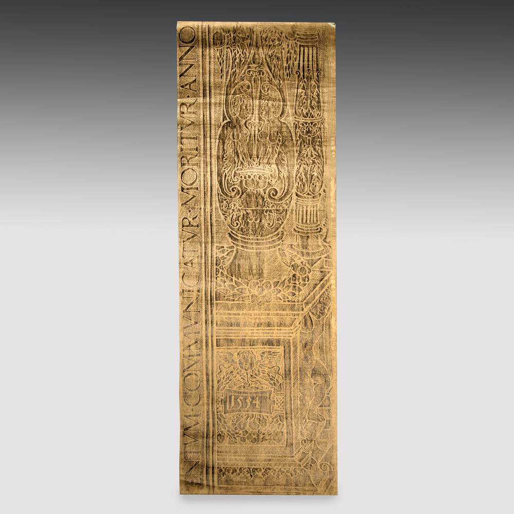 Brass rubbings are reproductions of engraved commemorative plaques, created by placing paper over the plate and rubbing with crayon or chalk. These rubbings were created by Jean Farrell in the 1960s and feature Belgian memorial stones dating from the 14th and 15th centuries. They went on to many private collections as well as museums.