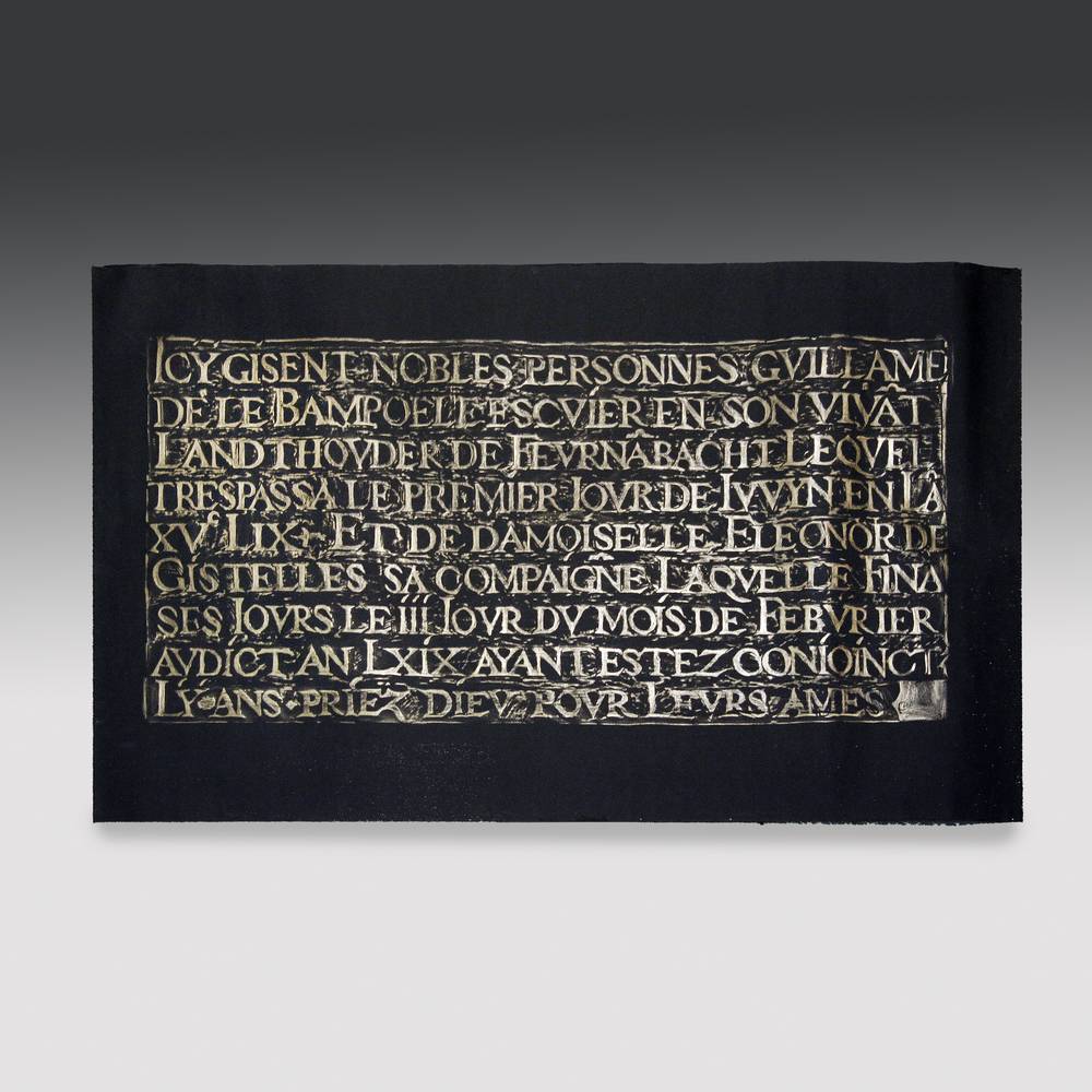 Brass rubbings are reproductions of engraved commemorative plaques, created by placing paper over the plate and rubbing with crayon or chalk. These rubbings were created by Jean Farrell in the 1960s and feature Belgian memorial stones dating from the 14th and 15th centuries. They went on to many private collections as well as museums.