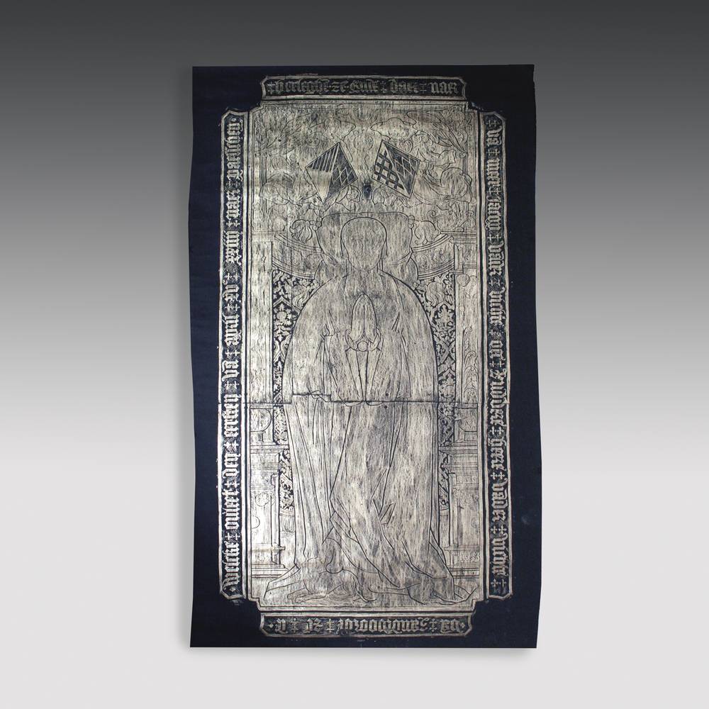 Brass rubbings are reproductions of engraved commemorative plaques, created by placing paper over the plate and rubbing with crayon or chalk. These rubbings were created by Jean Farrell in the 1960s and feature Belgian memorial stones dating from the 14th and 15th centuries. They went on to many private collections as well as museums.
